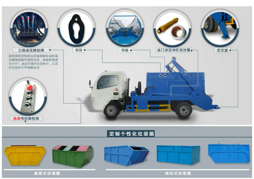 標(biāo)準(zhǔn): 擺臂式垃圾車:由底盤、垃圾箱(斗)、擺臂減速緩沖油缸等組成,其特點(diǎn)是垃圾箱能與車體分開,實(shí)現(xiàn)一車與多個(gè)垃圾箱的聯(lián)合使用。