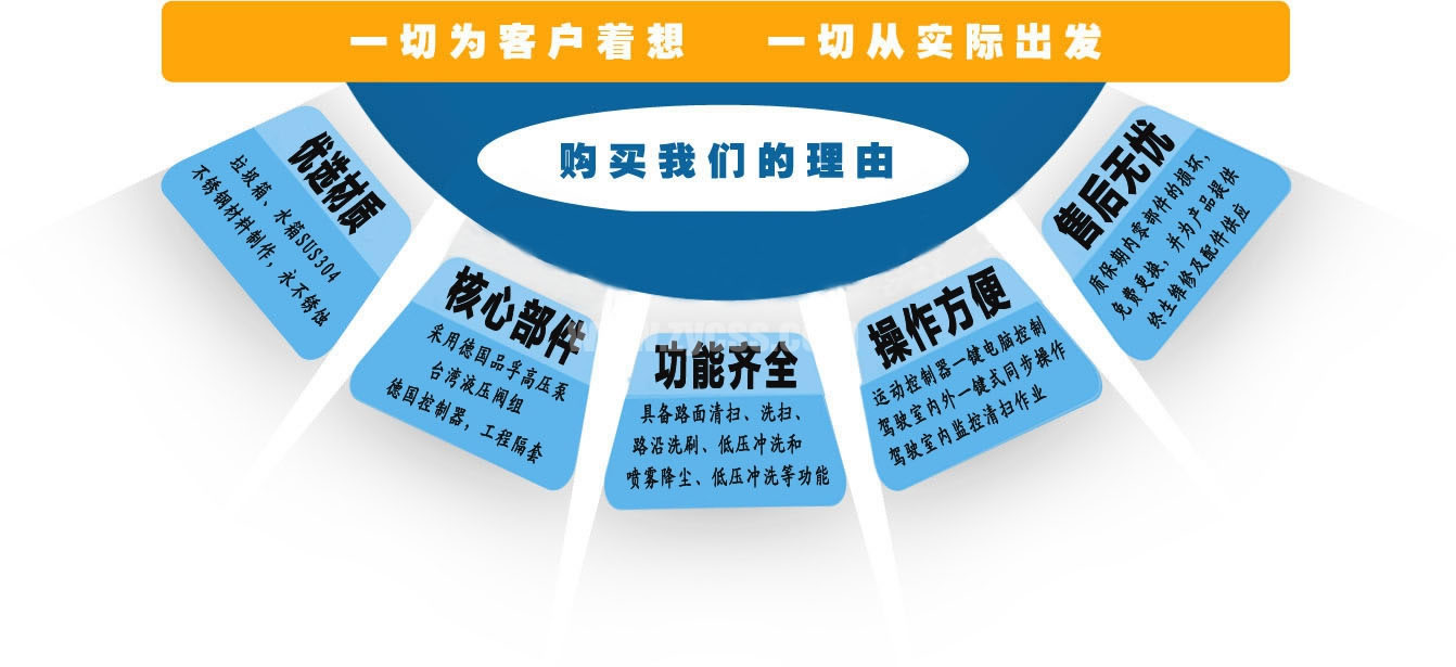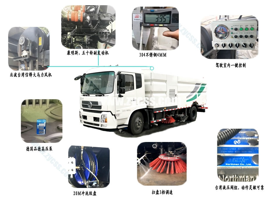 上裝配置: 1、帶2個(gè)中置掃盤;中置超寬吸嘴;雙層吸塵筒;康明斯170馬力副發(fā)動(dòng)機(jī);臺(tái)灣液壓閥;大力馬達(dá);德國(guó)高壓水泵(前沖/側(cè)噴/中噴/后噴霧)/側(cè)沖洗水槍/垃圾箱自潔裝置);萬(wàn)向高壓路沿清洗;威龍低壓泵(前沖),氣動(dòng)球閥控制;4mm不銹鋼垃圾箱;不銹鋼水箱;德國(guó)控制器;尾部箭頭燈;機(jī)油、垃圾箱、水箱均帶防溢或低位報(bào)警裝置;倒車及洗掃狀態(tài)室內(nèi)監(jiān)視器;多種語(yǔ)音提示;倒車自動(dòng)保護(hù)、防傾倒垃圾翻車保護(hù)、檢修安全保護(hù);20m高壓沖洗卷盤;刷臂轉(zhuǎn)動(dòng)機(jī)構(gòu)使用德國(guó)進(jìn)口高新耐磨工程隔套,免打黃油;精密冷彎無(wú)縫液壓油管;運(yùn)動(dòng)控制器一鍵電腦控制。 ![]() 產(chǎn)品功能特點(diǎn)
