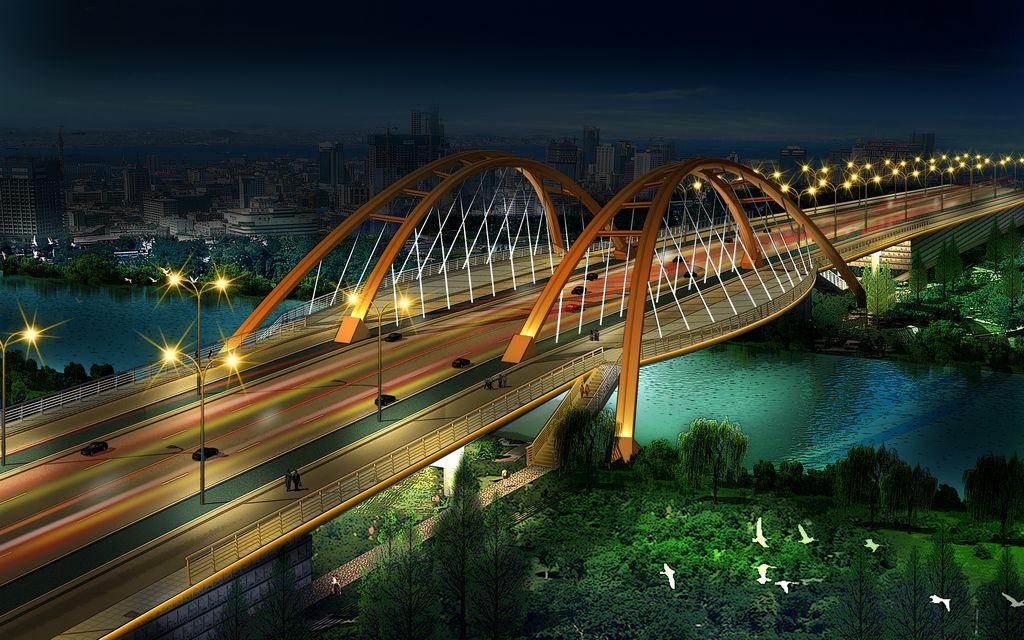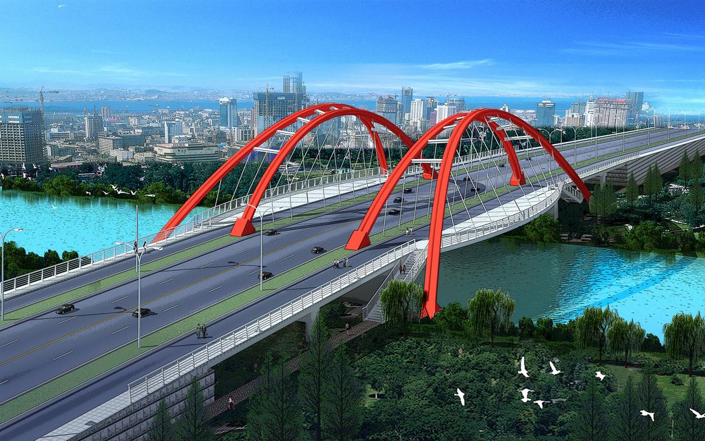 儀揚(yáng)河大橋位于儀揚(yáng)河南堤與南輔道連接線段,工程向北跨越儀揚(yáng)河。儀揚(yáng)河為人工開挖的運(yùn)河,往西南約3km與長江主航道相接,規(guī)劃為V級(jí)航道,通航凈空為45×5.0m。水位隨潮汐而上下波動(dòng),常水位為4.8m左右,相應(yīng)的水面寬度為60m。 本橋橋位處儀揚(yáng)河河道中心線與橋梁軸線的呈80°斜交。為保證通航凈空和減小橋梁對(duì)儀揚(yáng)河行洪的影響,本橋方案設(shè)計(jì)時(shí)考慮為一跨過河的方案。根據(jù)現(xiàn)場踏勘和相應(yīng)的測量成果,我院分別提供了不同的橋型方案布置,并做了方案比選,最終橋跨布置為2×25m空心板+60m預(yù)應(yīng)力砼提籃式系梁拱+30+4×25m空心板梁,橋梁總長為246.79m。